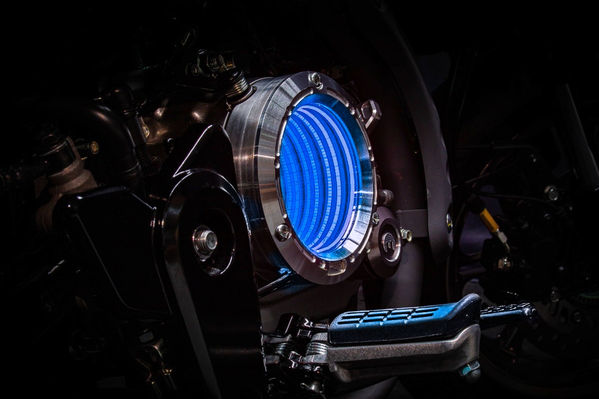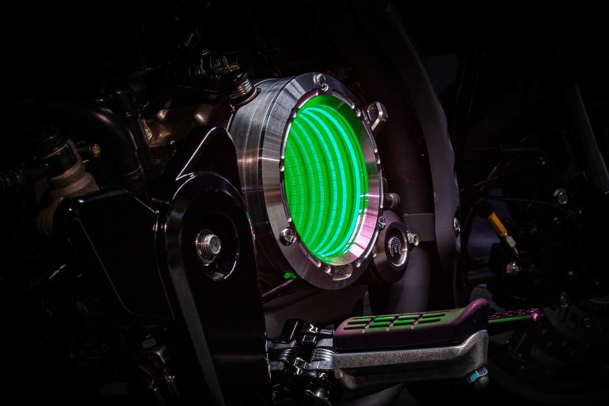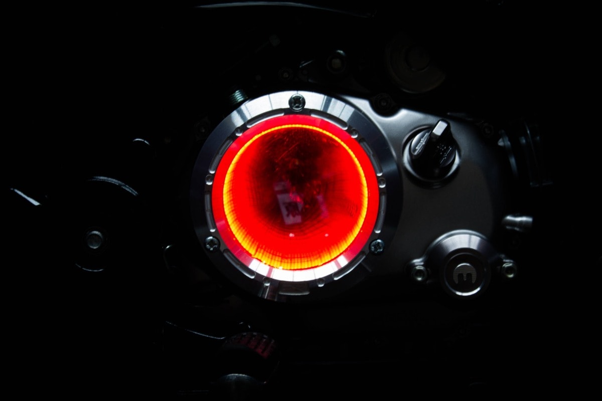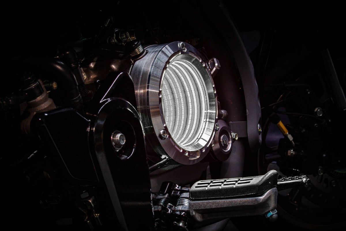 スイッチをONにした瞬間、まるでエンジン内部へ吸い込まれるような幻想的なブラックホールの輝きを放つクラッチアウターカバー。