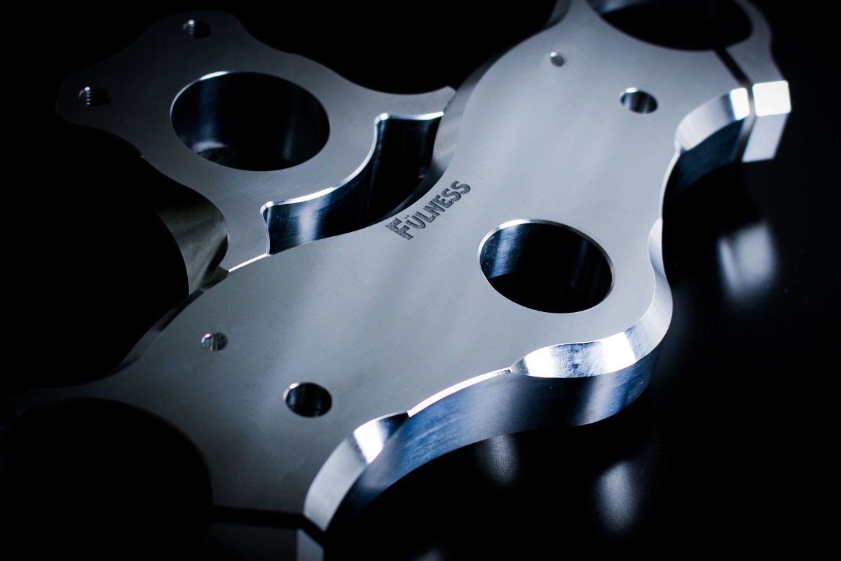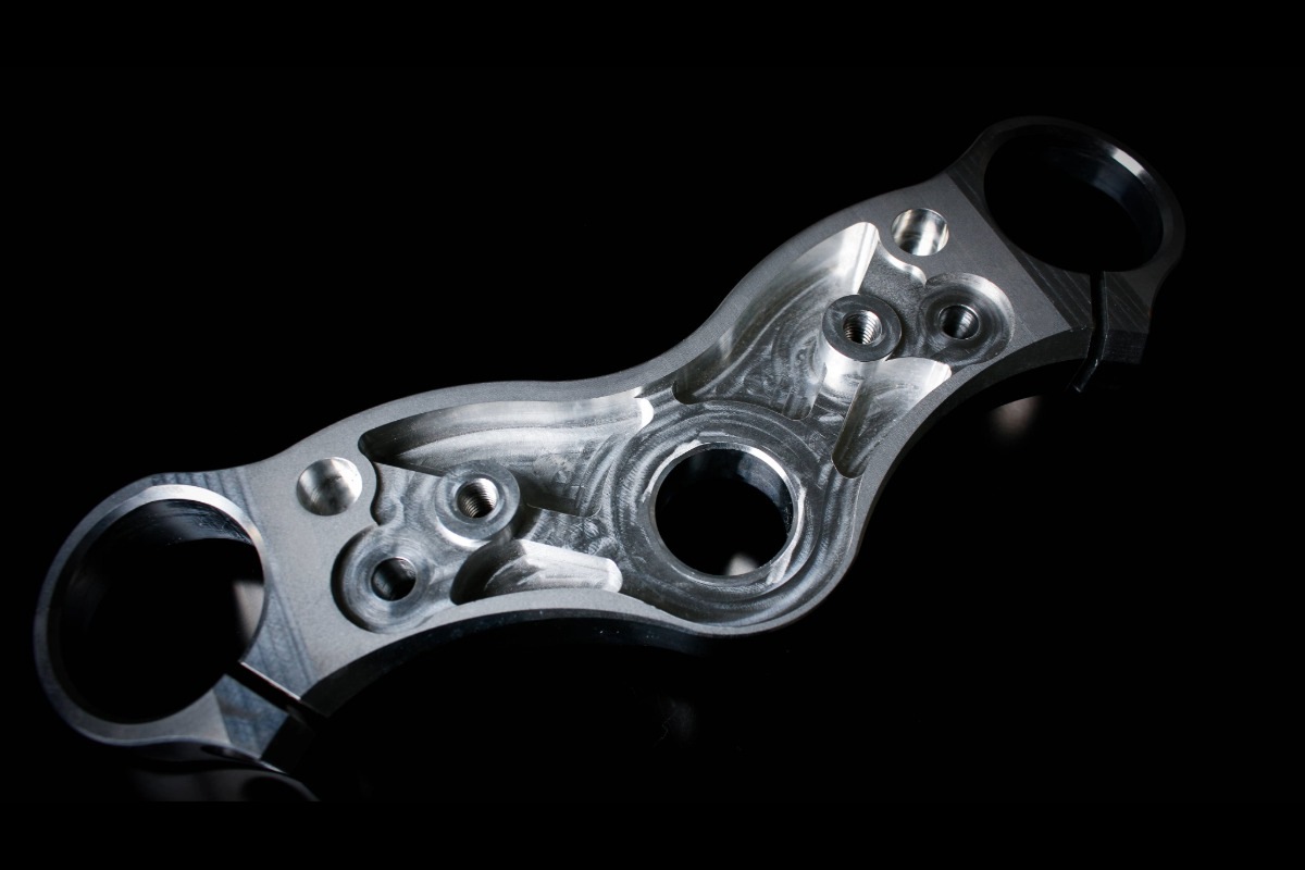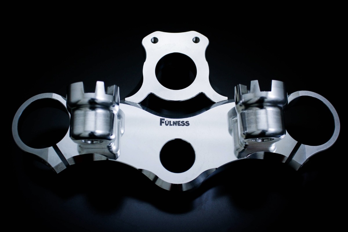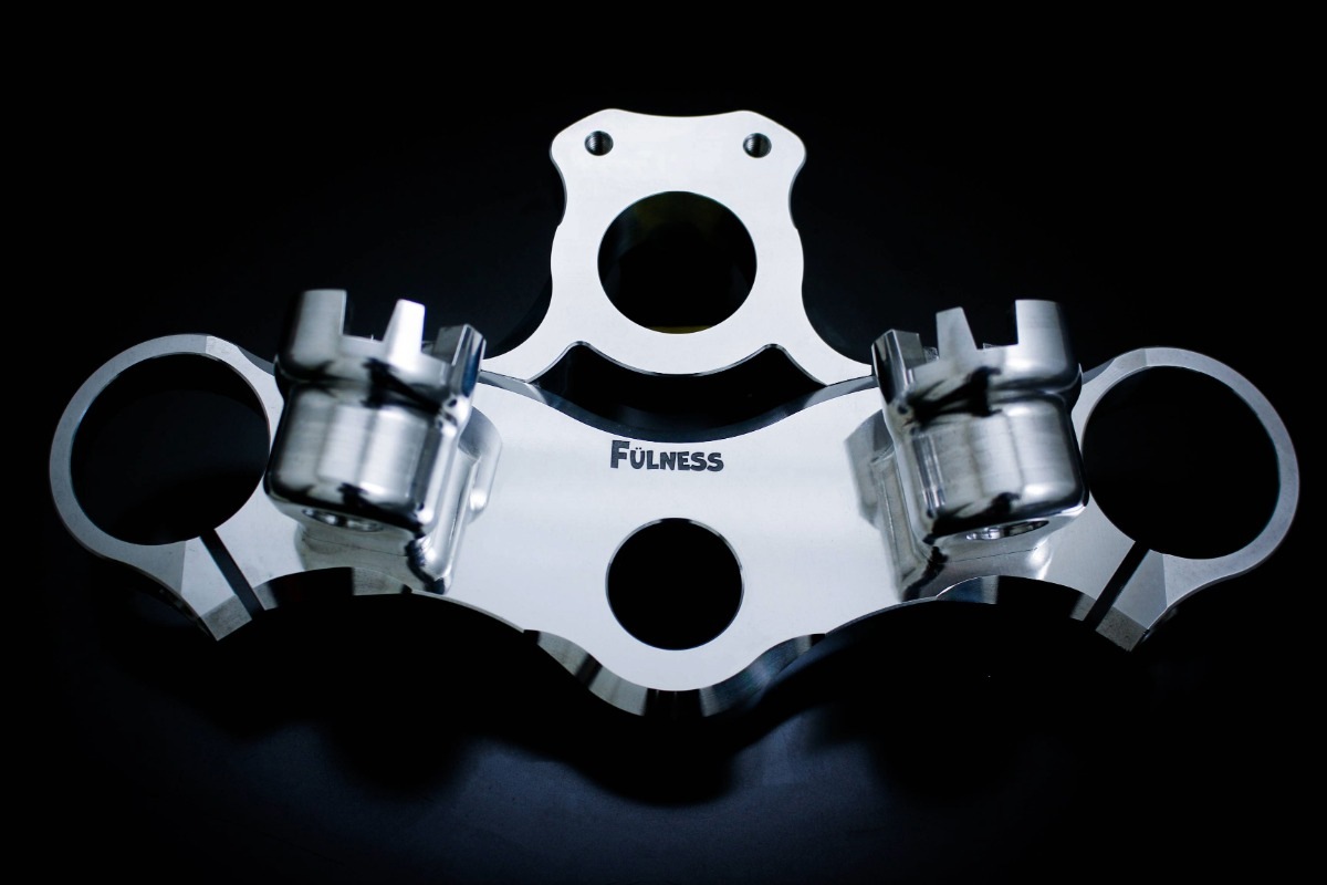 翼をイメージした美しい削り出しのトップブリッジは、このキットのためだけに開発された専用品です。純正の制約から脱却することで、デザイン性と機能性を徹底的に追求しました。懸念されたメーターへの干渉といった課題もクリアし、理想的なハンドルポジションを実現しています。